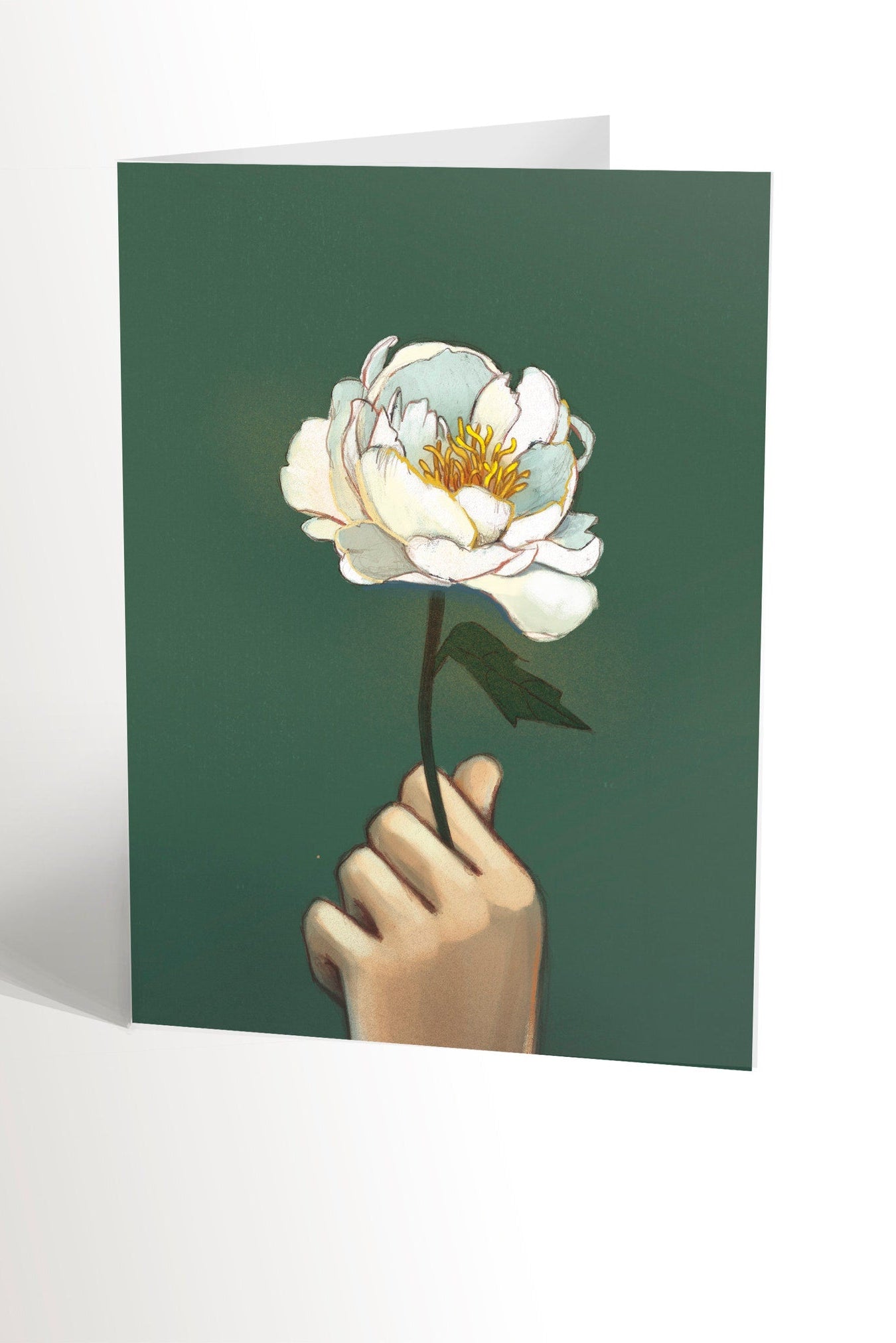 Carte de souhait, sans texte, représentant une main tenant une pivoine blanche!