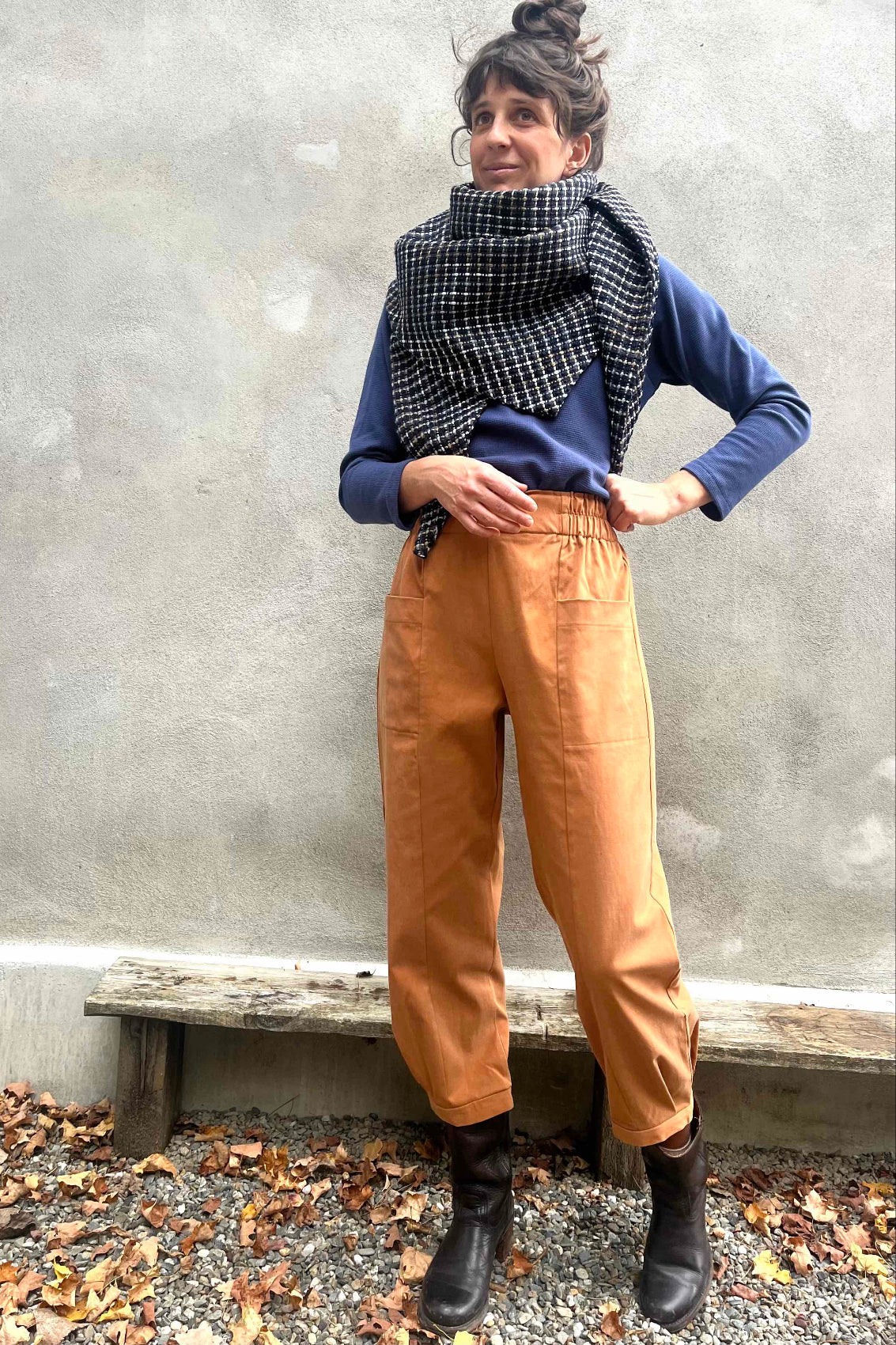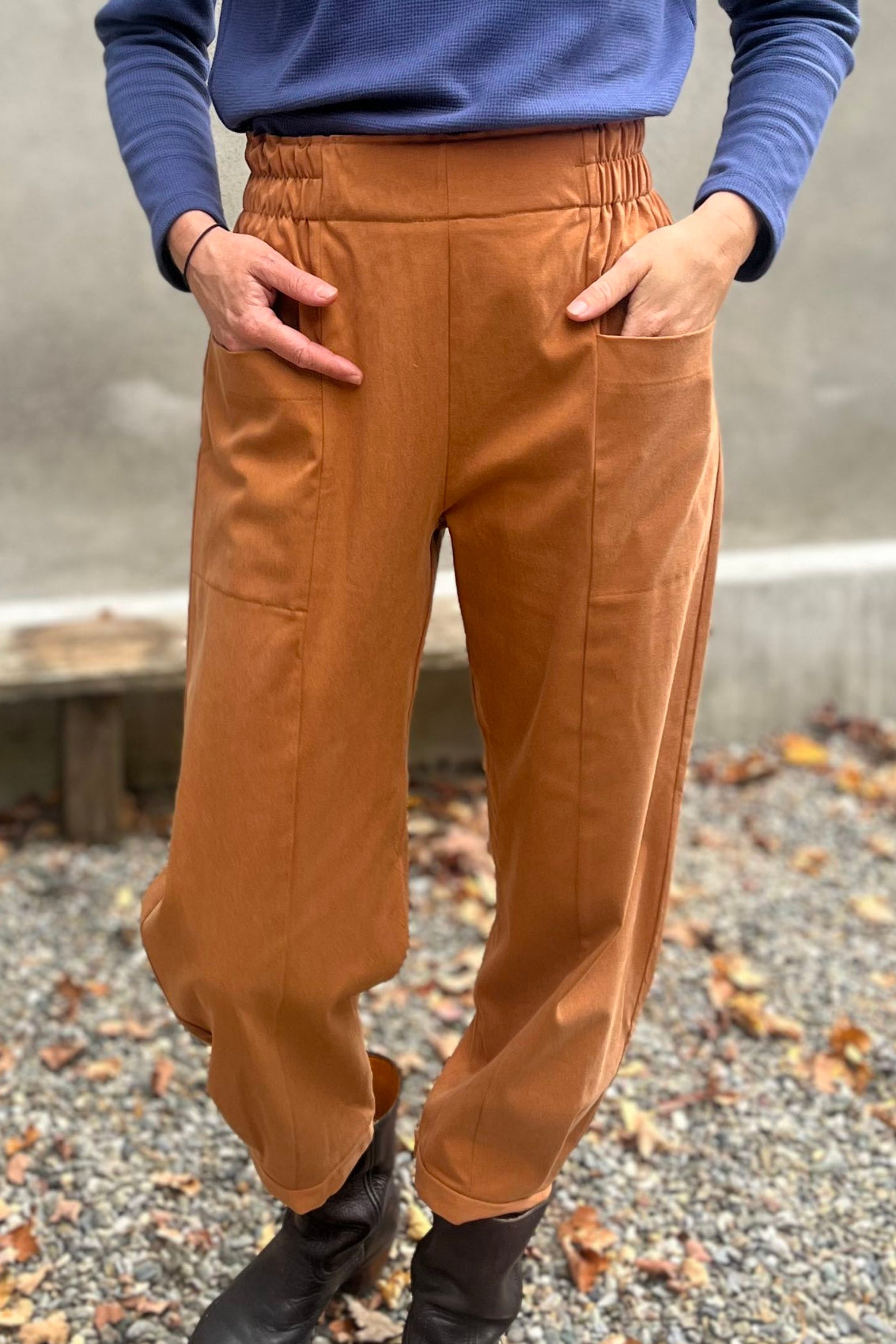 These barrel leg pants end with a tighter band at the bottom and have two large pockets on the front.