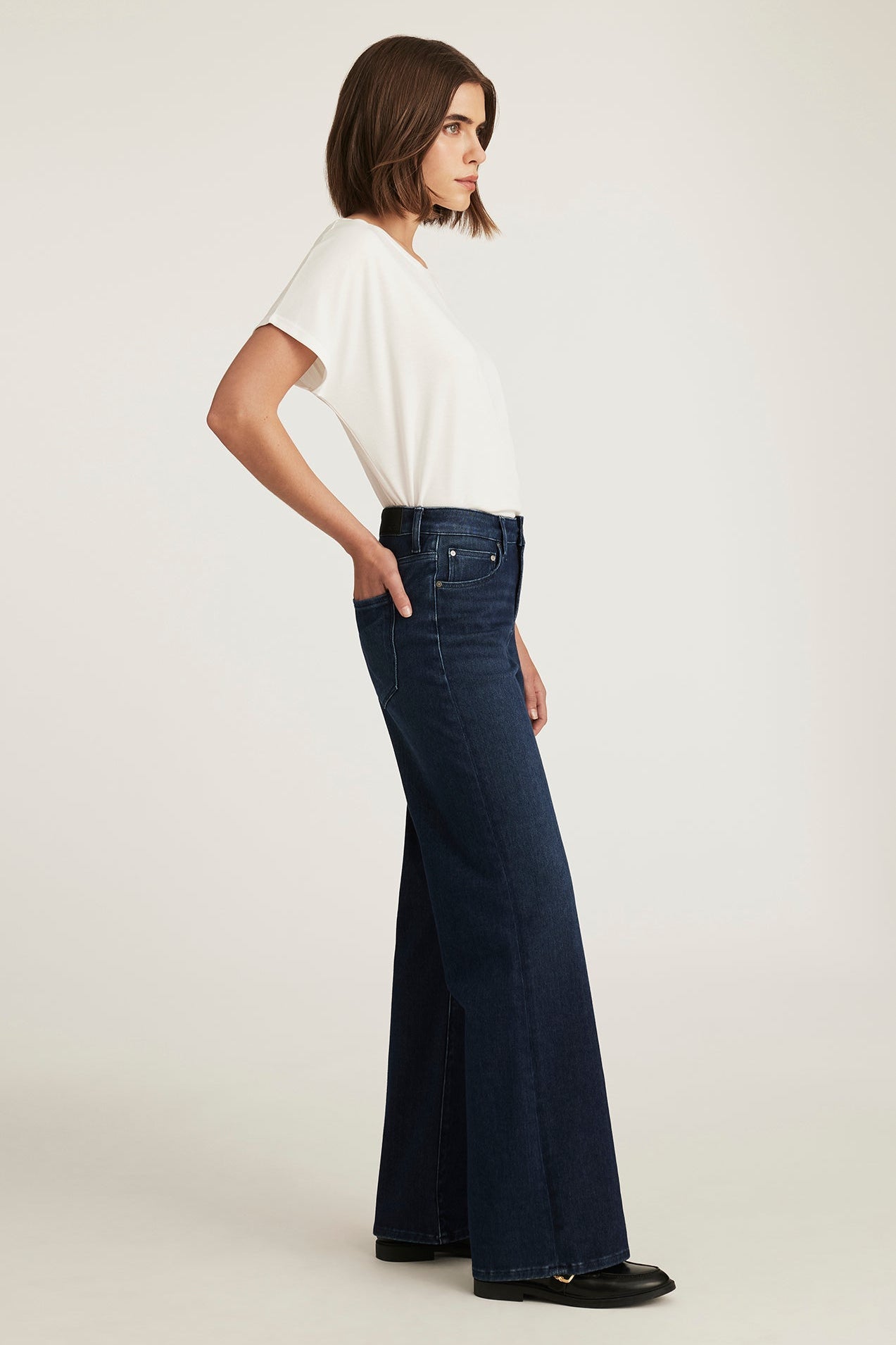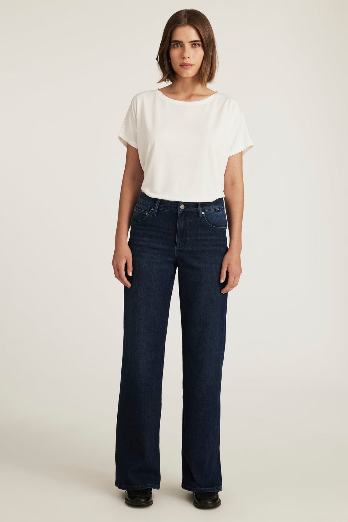 With its loose, relaxed fit and mid-rise waist, Sabrina naturally flatters your figure from hip to hem. This style comes in a dark indigo wash with tonal whiskering.