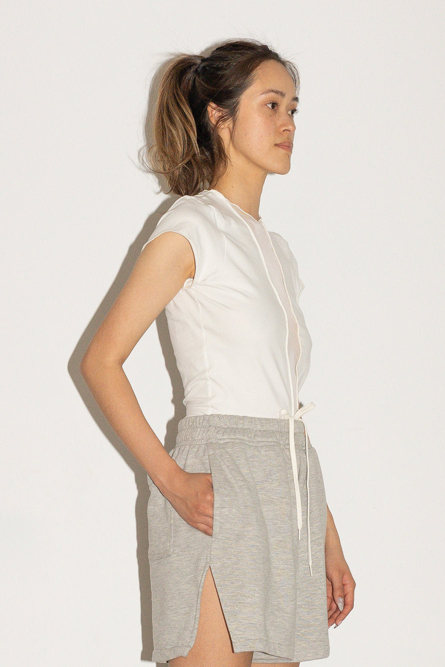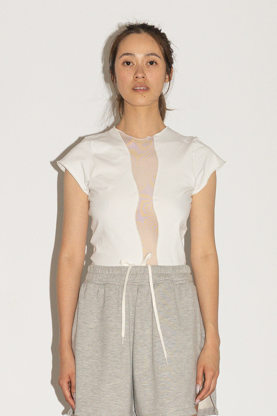 White short-sleeved shirt with mesh details. Reinforced seams on the sleeves and hem for increased durability.