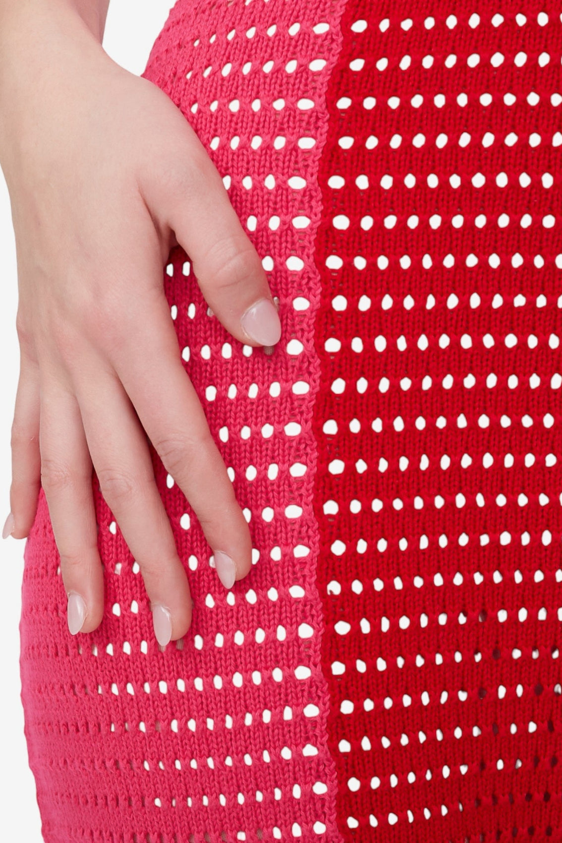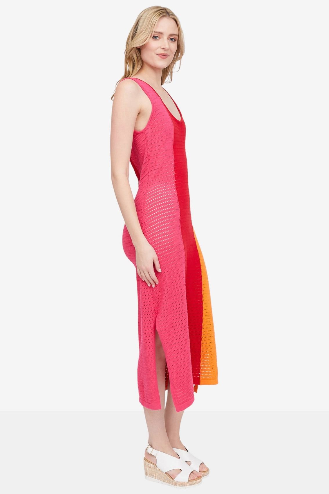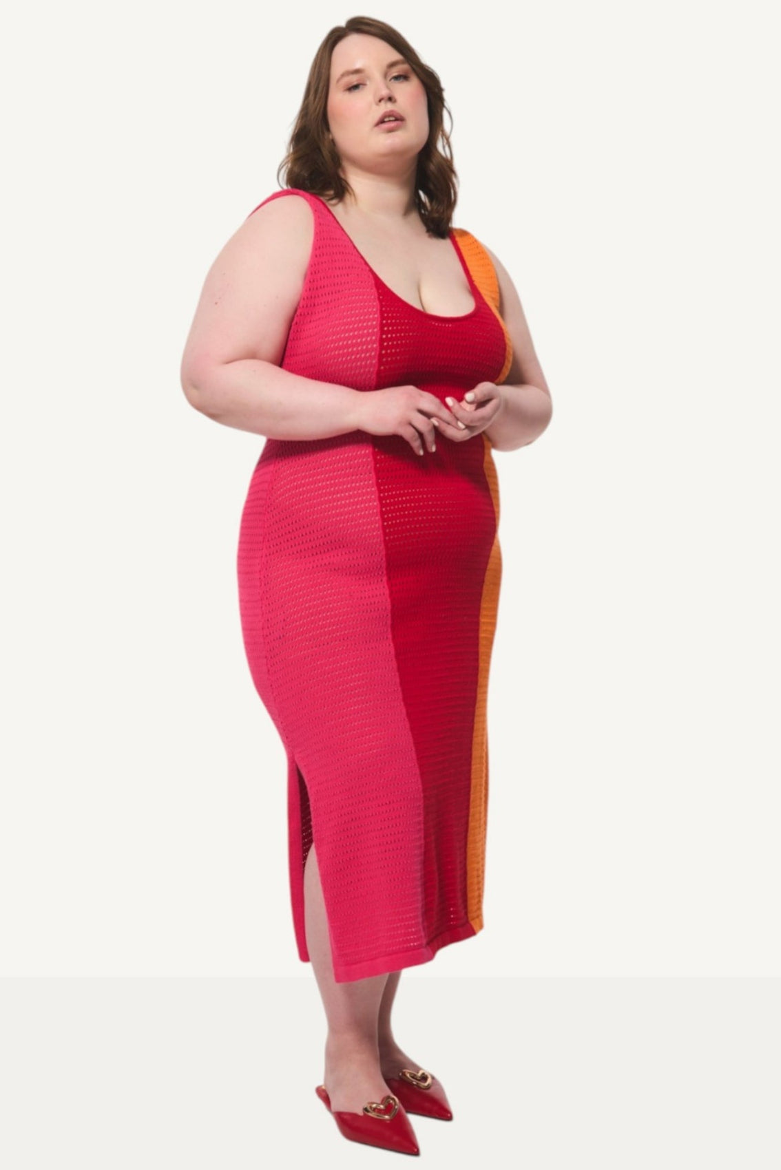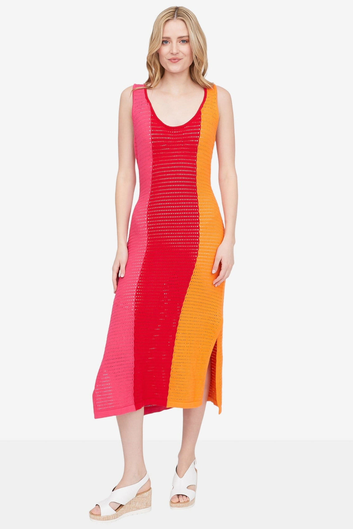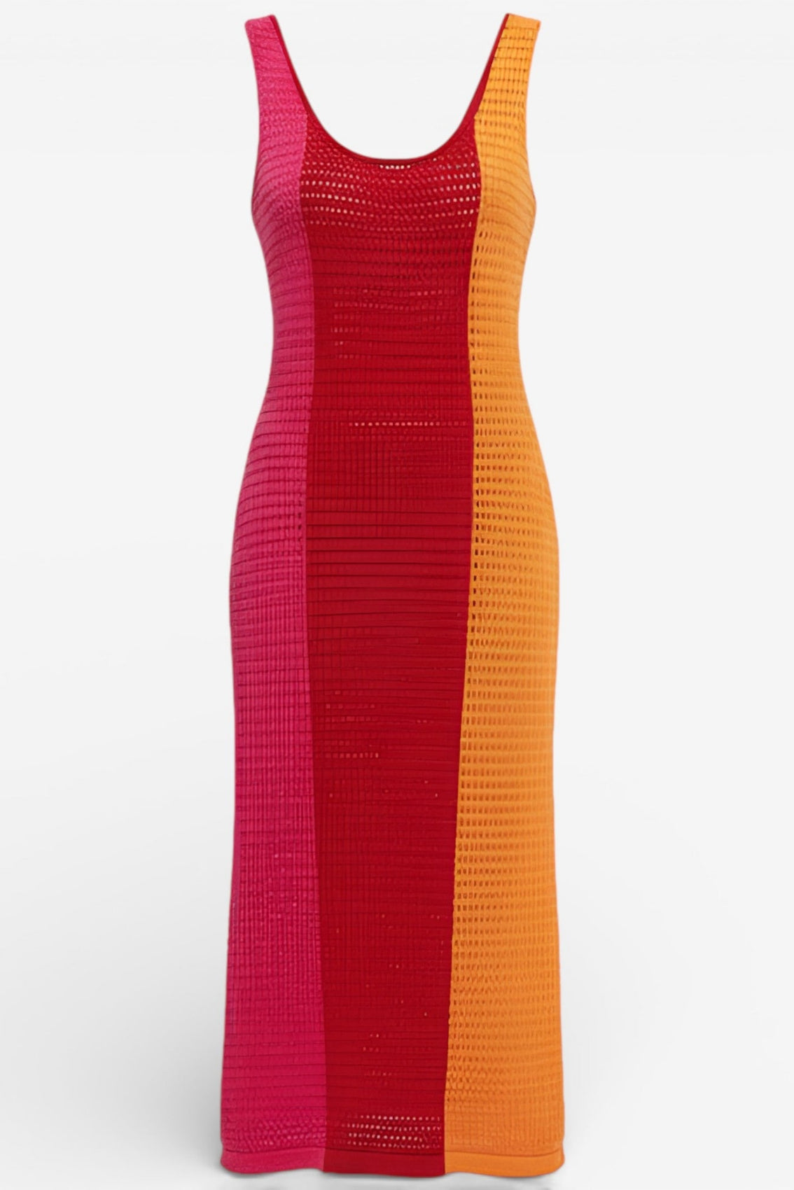 Ajoutez une touche estivale à votre look avec cette robe en maille crochet tricolore. Ses rayures rouges, orangées et roses mettent la silhouette en valeur, tandis que sa coupe près du corps reste confortable grâce à une maille extensible. Les fentes sur les côtés apportent du mouvement et de l’aisance. Longueur sous le genou et facile à porter avec un soutien-gorge, elle se porte aussi bien au quotidien qu’au-dessus d’un maillot pour la plage.