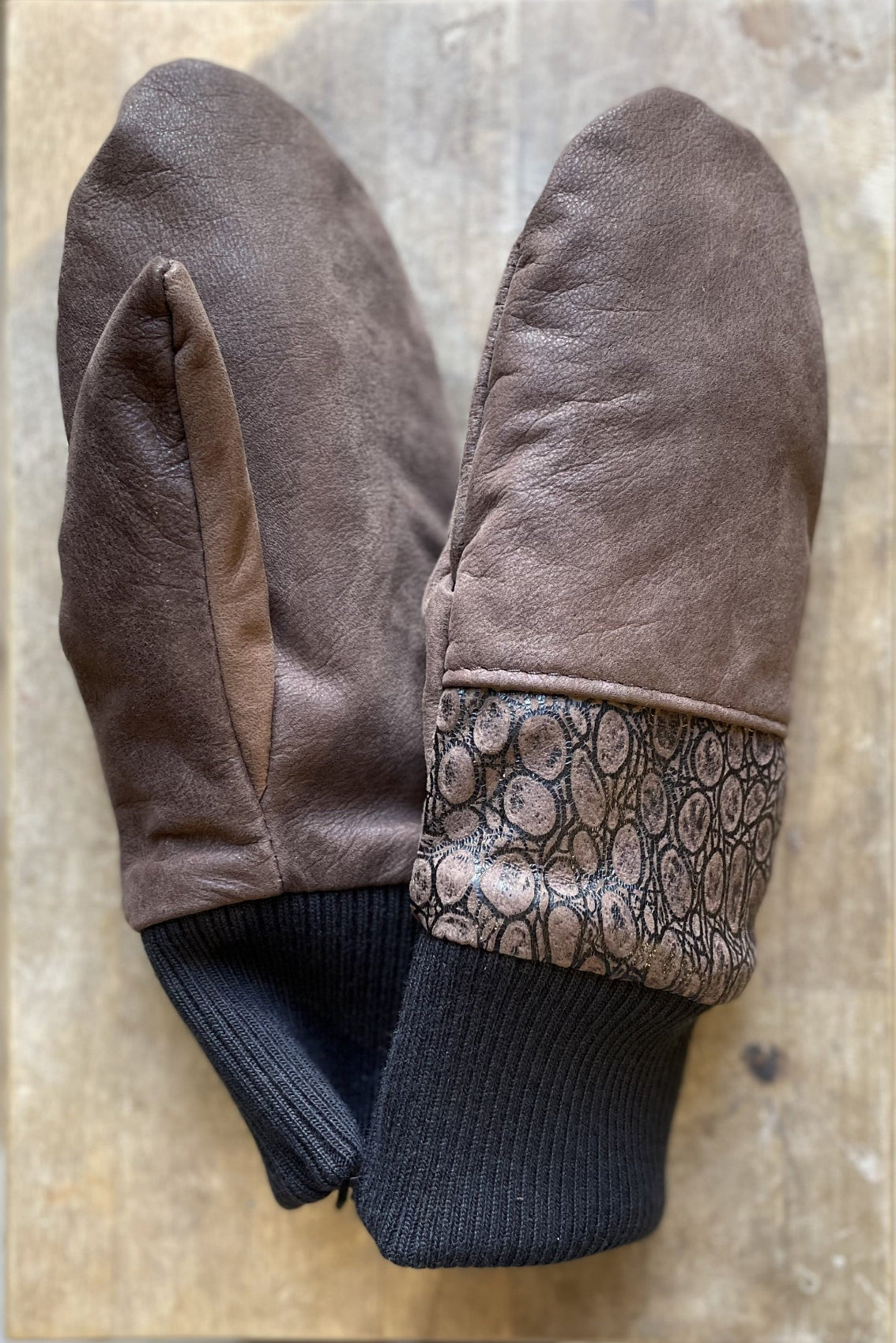 Pair of mittens made from recycled leather and suede, with ribbed cuffs.