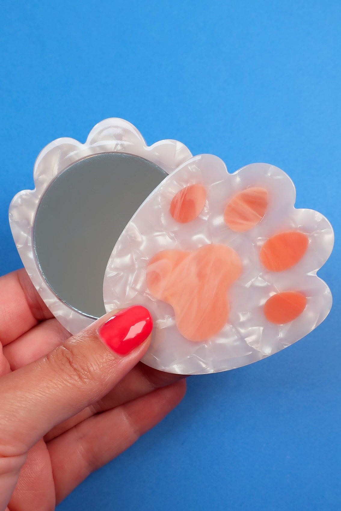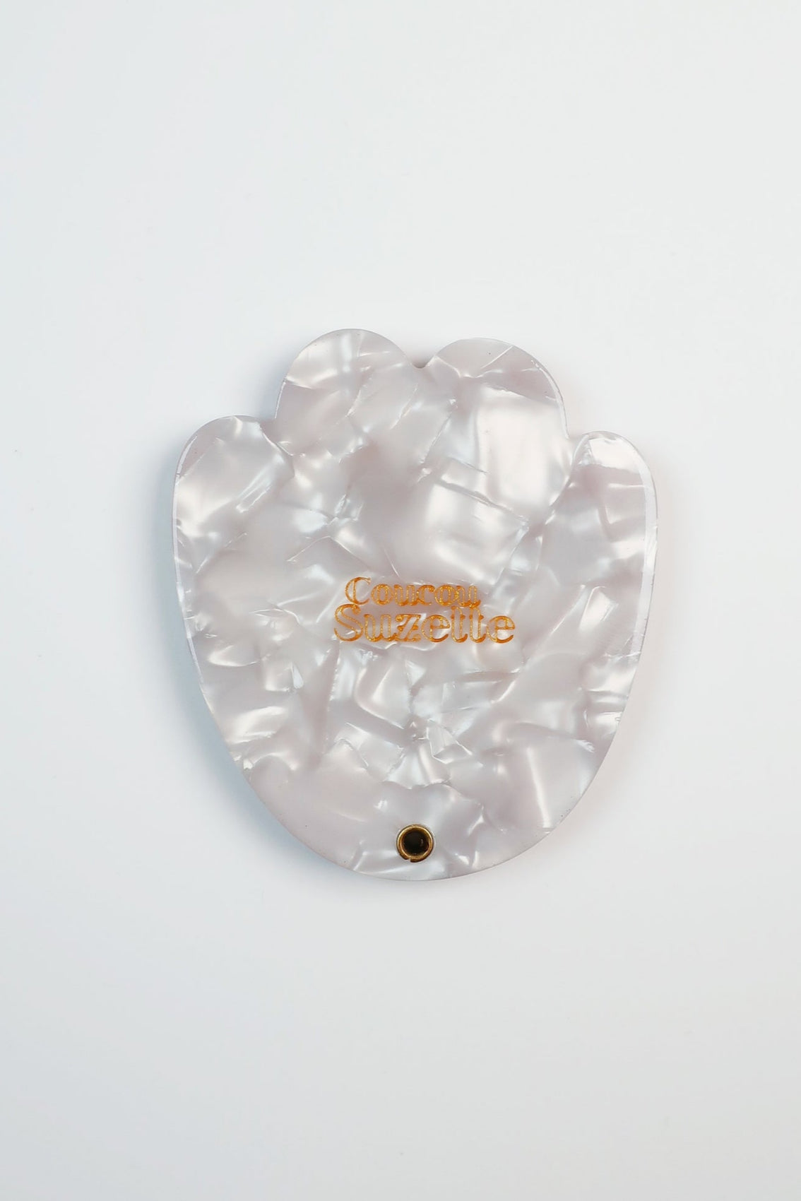 Pour checker sa dentition post-déj, on sort discretos ce miroir de poche en forme de pensée violette. Une bien belle fleur tout en effets & nuances de mauve, qui se glisse facilement dans un sac à main ou une banane.