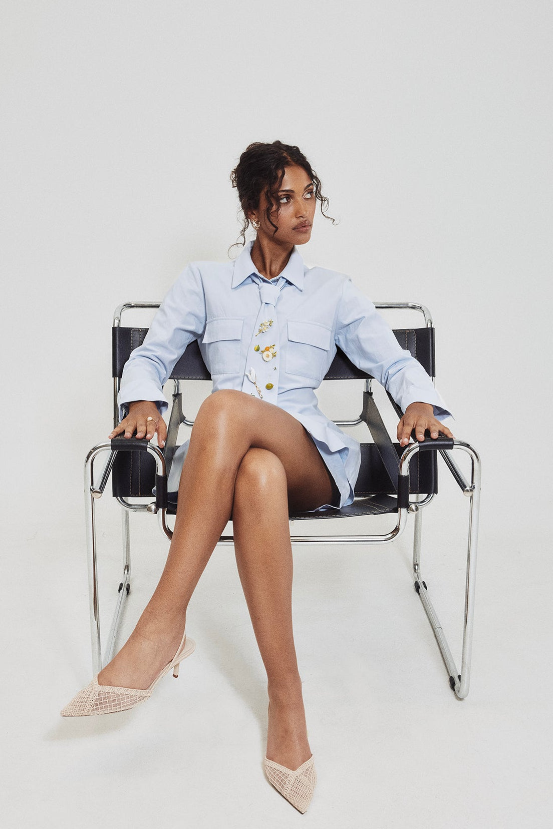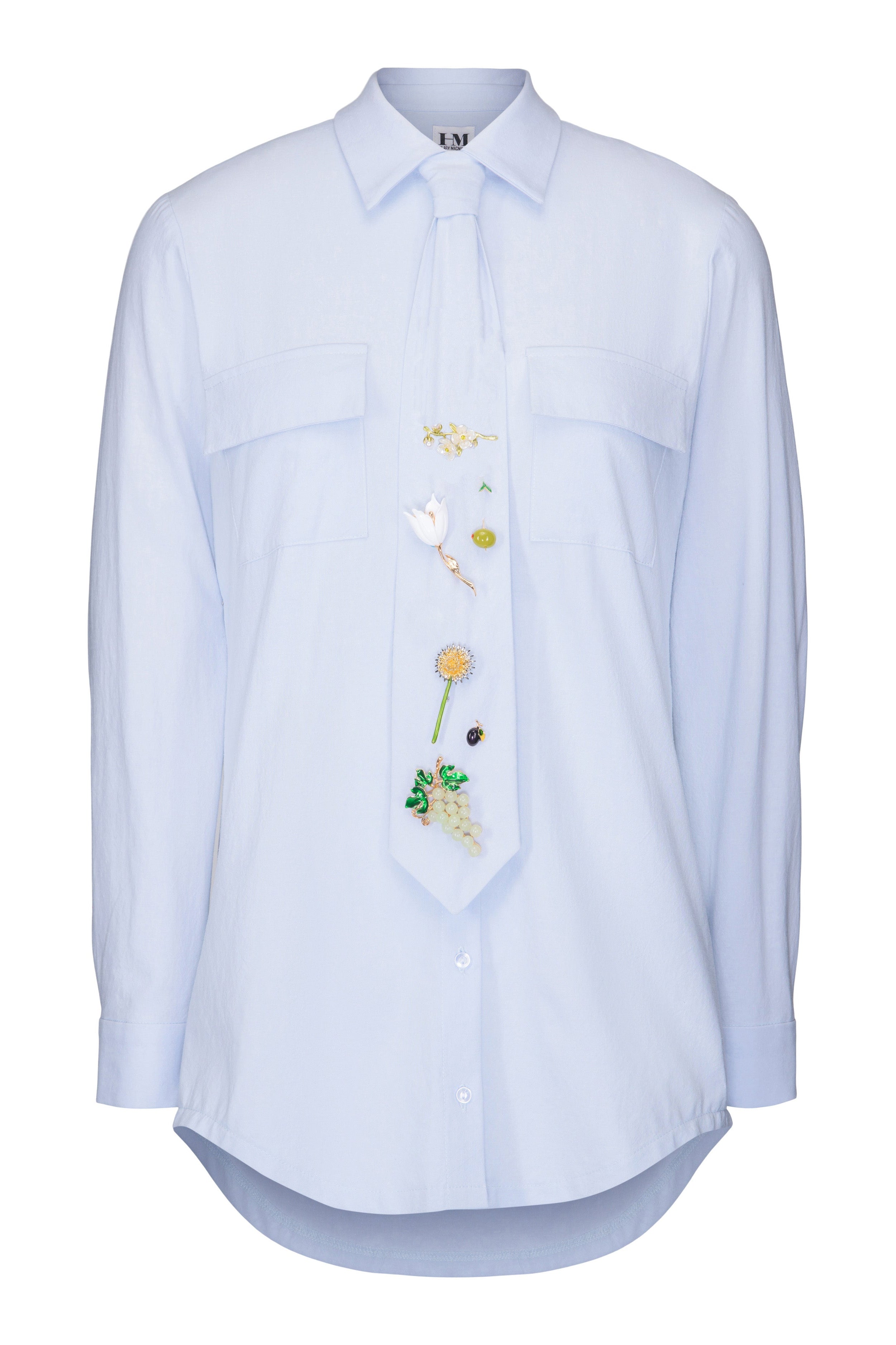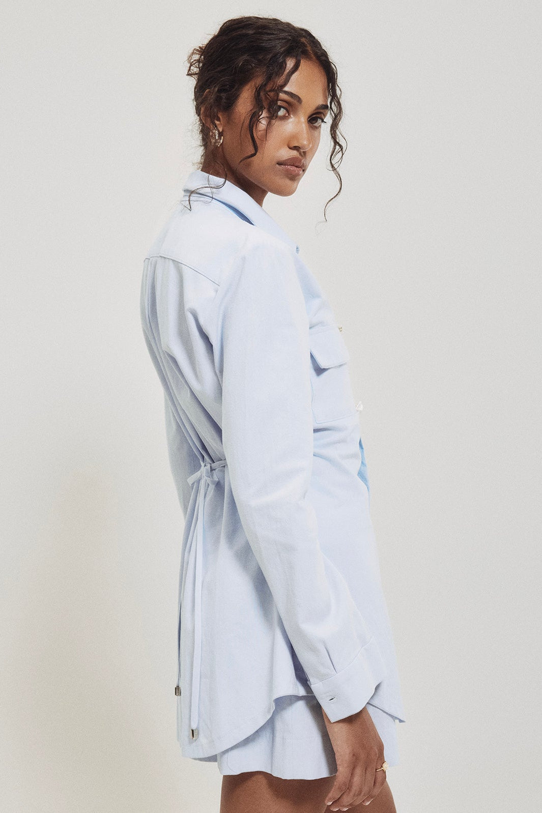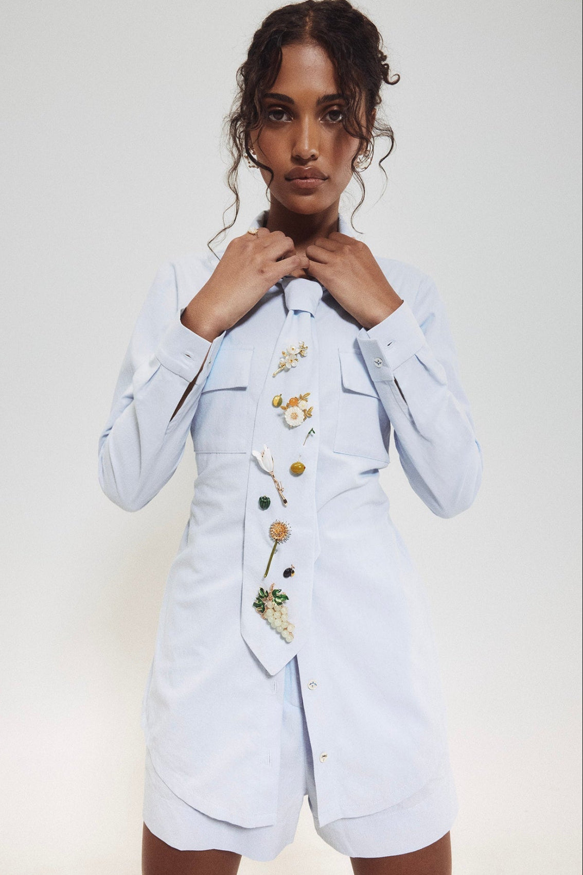 Cette chemise structurée en coton se distingue par sa cravate amovible avec épingles et ses cordons ajustables sur les côtés. Dotée de deux poches plaquées, elle se porte ouverte comme une veste ou fermée comme une chemise. Avec ses manches longues et ses trois boutons à la poitrine, elle est parfaite pour la mi-saison et s’adapte à tous les styles.