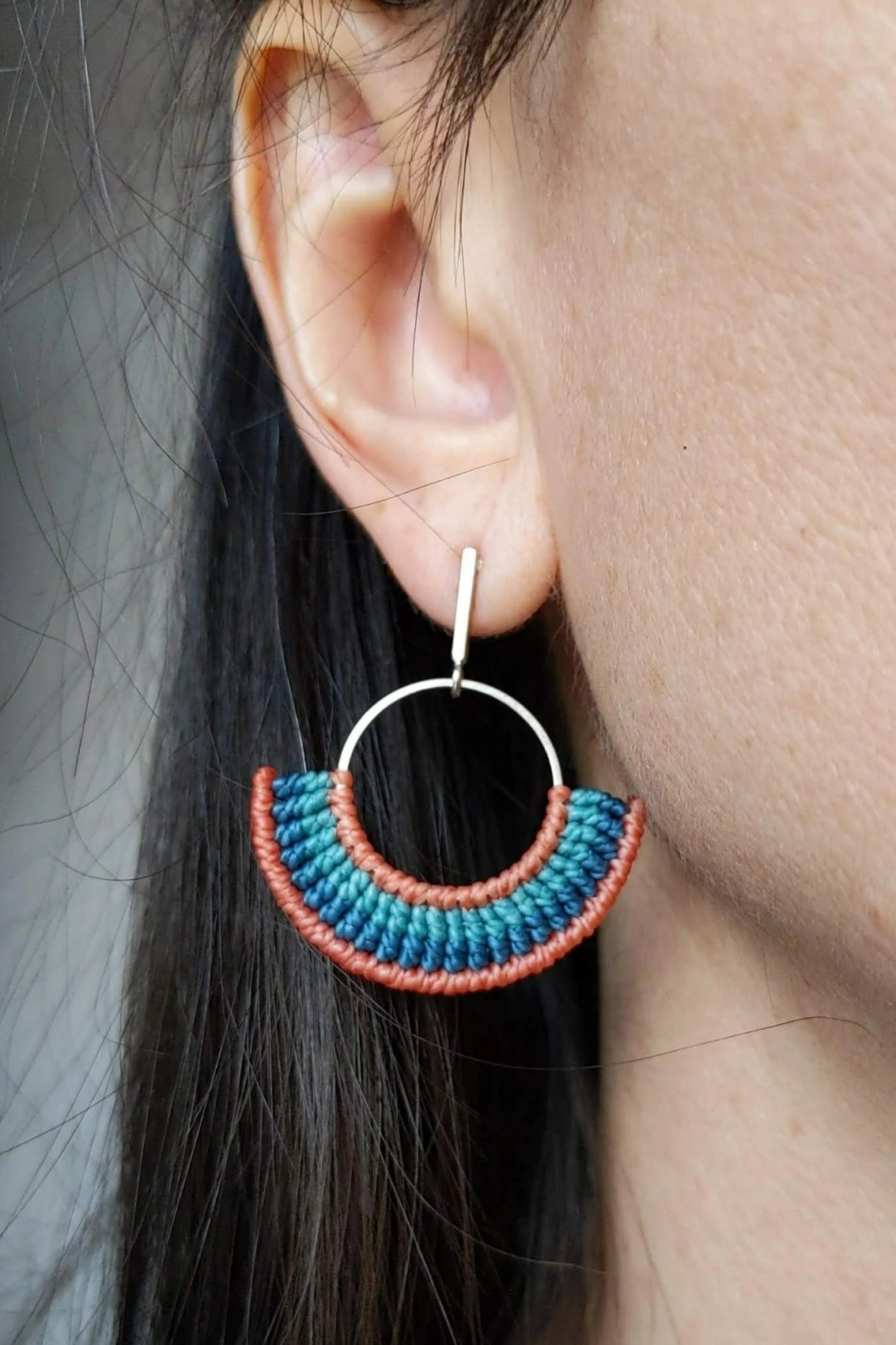 Boucles d'oreilles géométriques rondes avec un détail textile confectionné .. un tout petit noeud à la fois .. par la technique du micro-macramé.